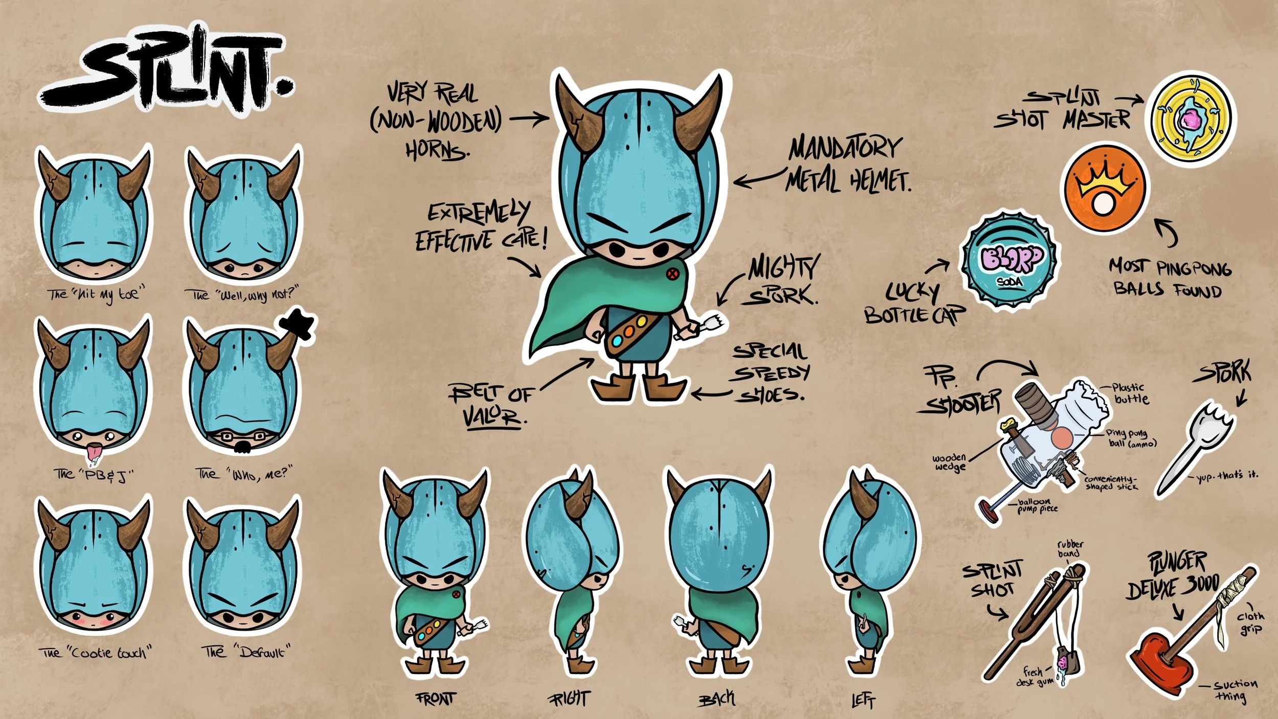 “Splint” is an original character who has a wild imagination, thinking up new and exciting worlds in his big helmet. He has an array of makeshift weapons to aid him on his riveting adventures. Because Splint is always full of energy, he excels at his tasks earning shiny colorful badges along the way (which he may or may not make himself).