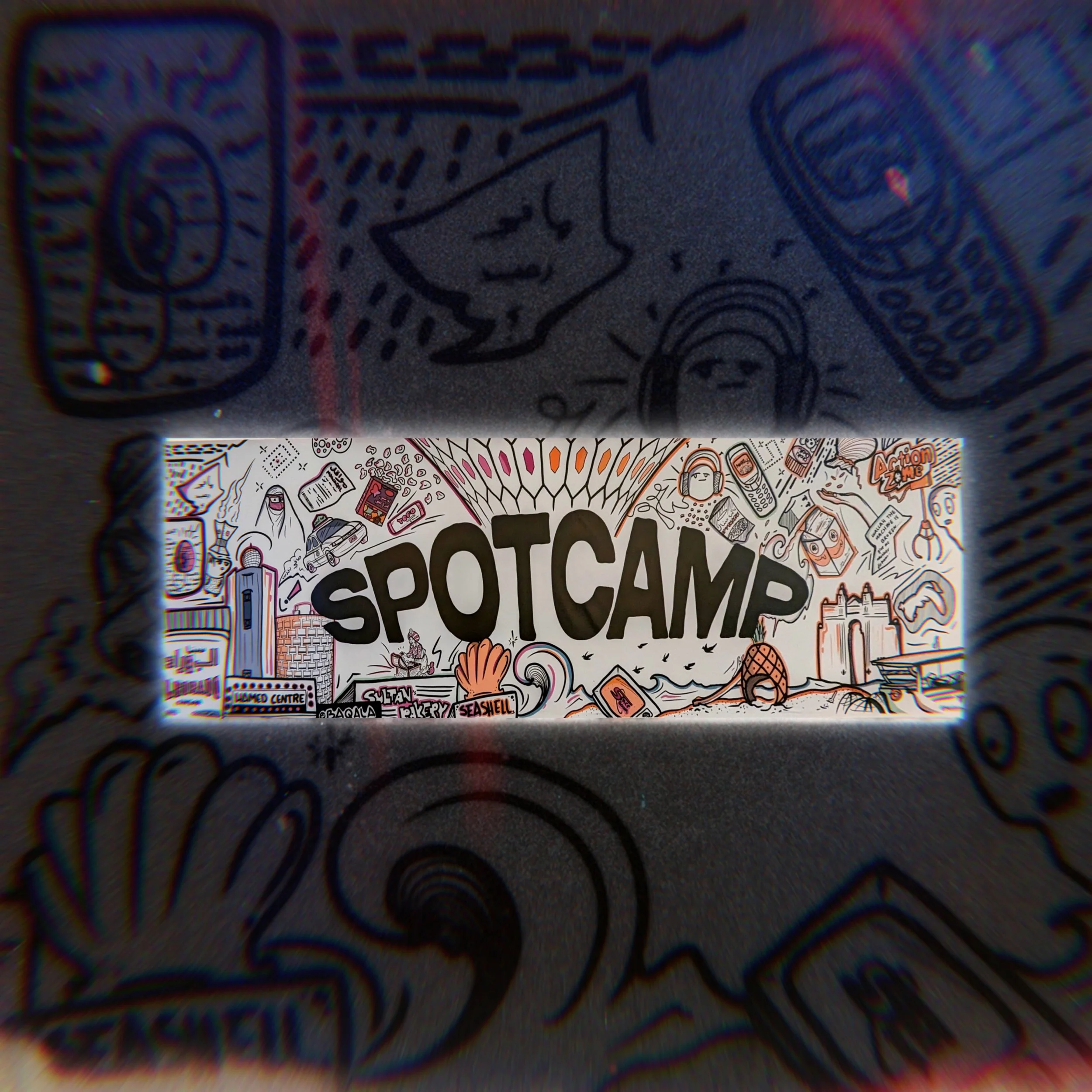 A Commissioned wall for The Spot at Manarat al Saadiyat featuring a number of nostalgic Abu Dhabi references that capture the culture. This piece sneaks in intentional misspellings of well-known references as a fun knock off joke. The wall tied the space together and became a conversation starter at the month-long event.