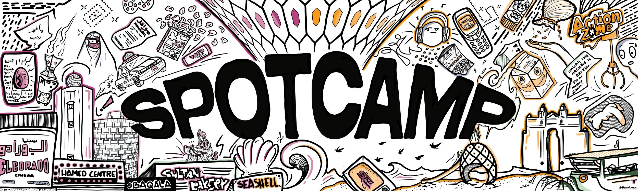 For Spot Camp, a creative networking pop-up by The Spot at Manarat Al Saadiyat in Abu Dhabi, I was commissioned to design a banner that blended humor, nostalgia, and local cultural references. The concept intentionally featured playful, misspelled nods to familiar Abu Dhabi icons, giving the event a quirky and memorable identity that encouraged curiosity and interaction.