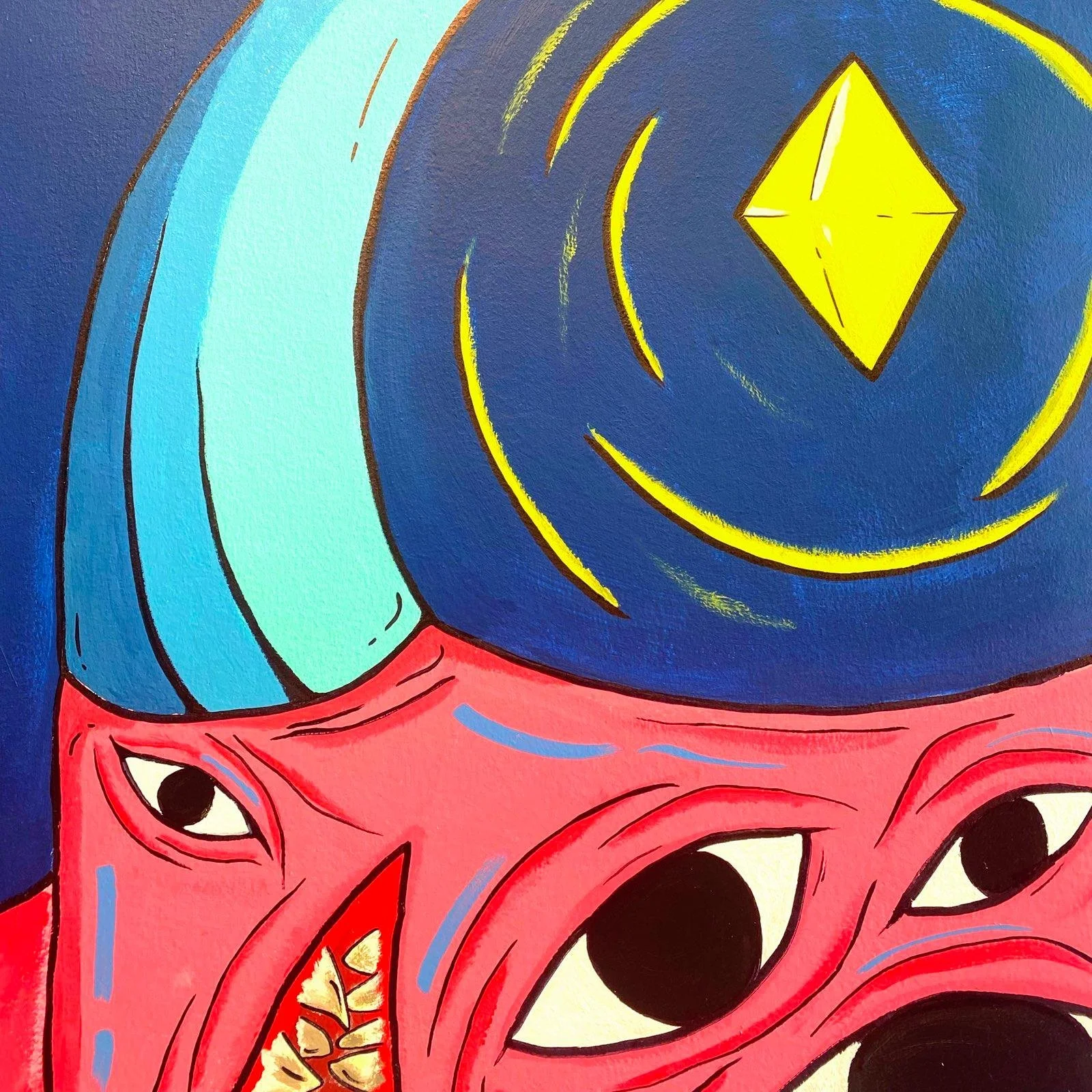 This piece aims to emulate the eerie feeling of being watched and judged by a toxic society. The mutated creature in the center represents said society with its wide eyes observing your every move. Above it, there is a scared golden gem representing an unachievable goal. This is an illusion that the crab desires despite the journey dismantling it in the process. Altogether, the dilemma illustrated in this piece is what I call “The See”.